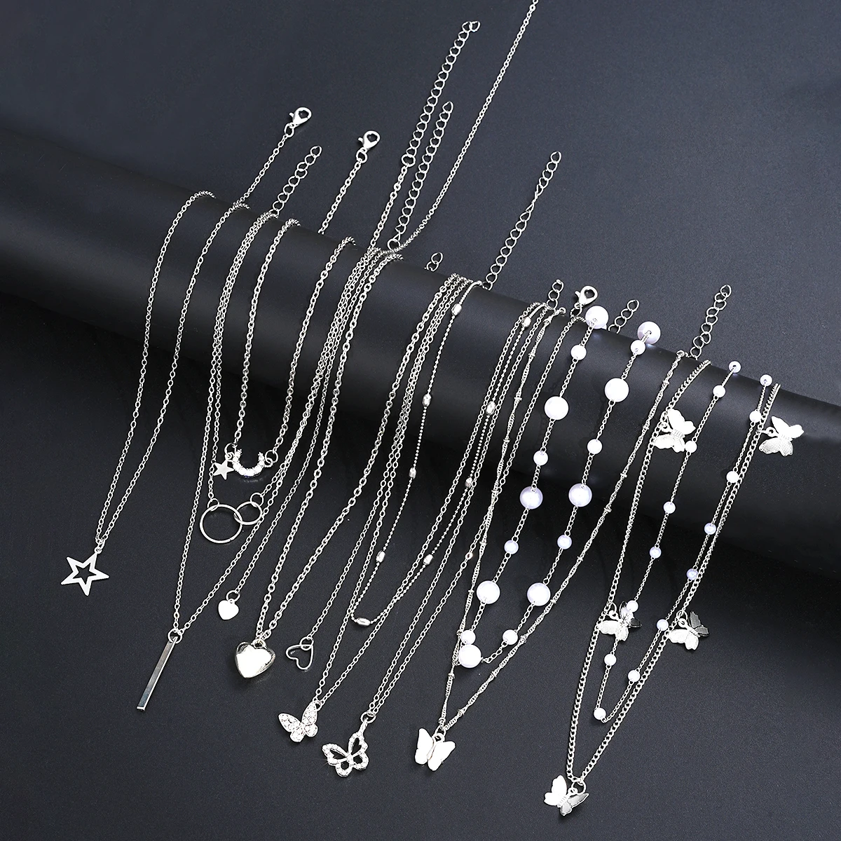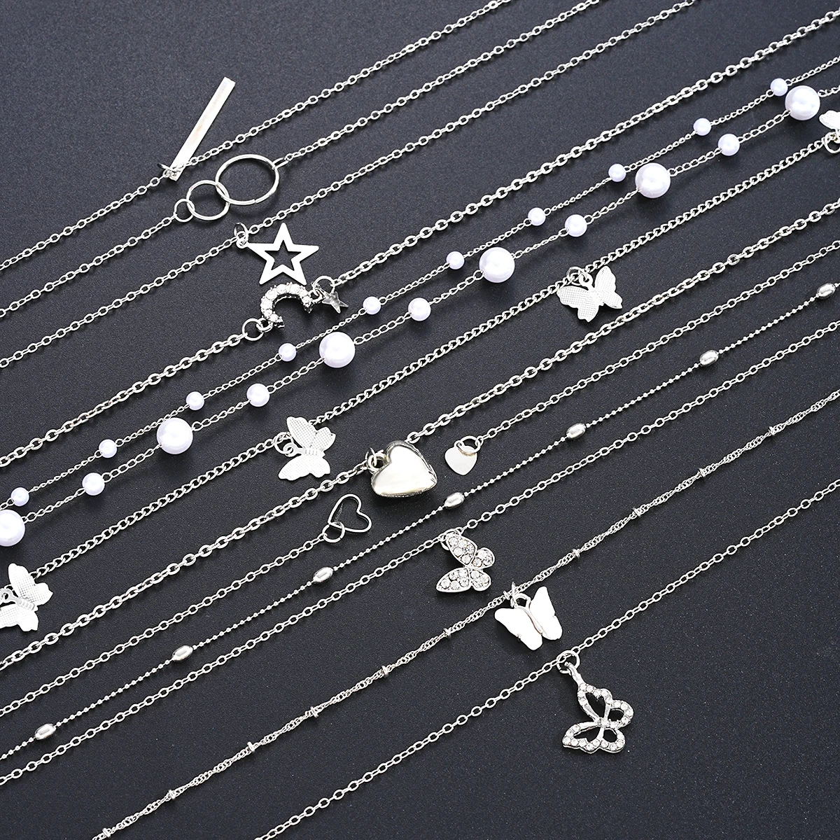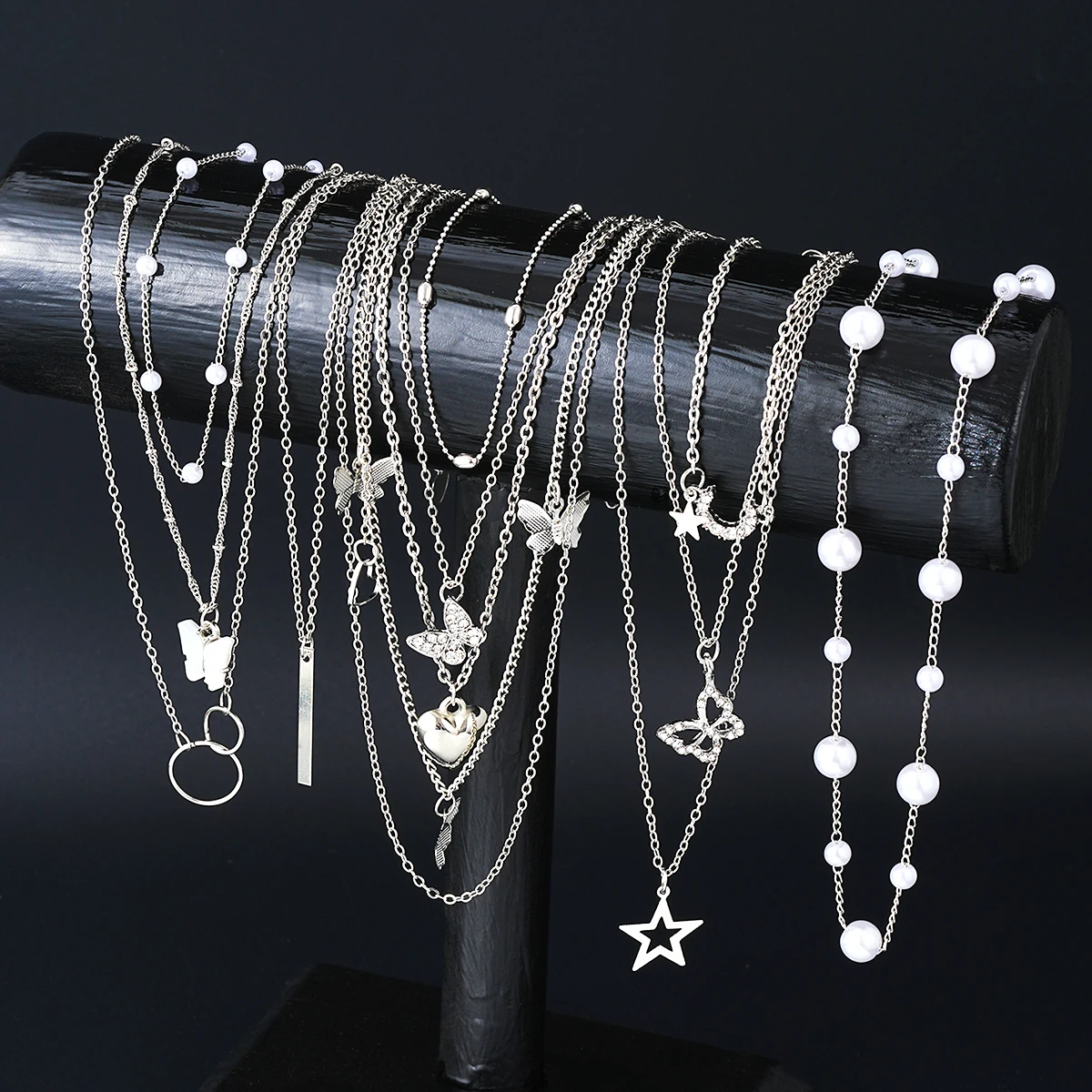 11pcs Simple Heart Butterfly Moon Pendant Necklaces For Women Elegant Silver Color Star Crystal Imitation Pearl Jewelry Set 2025