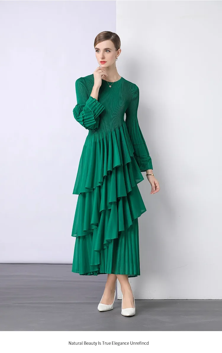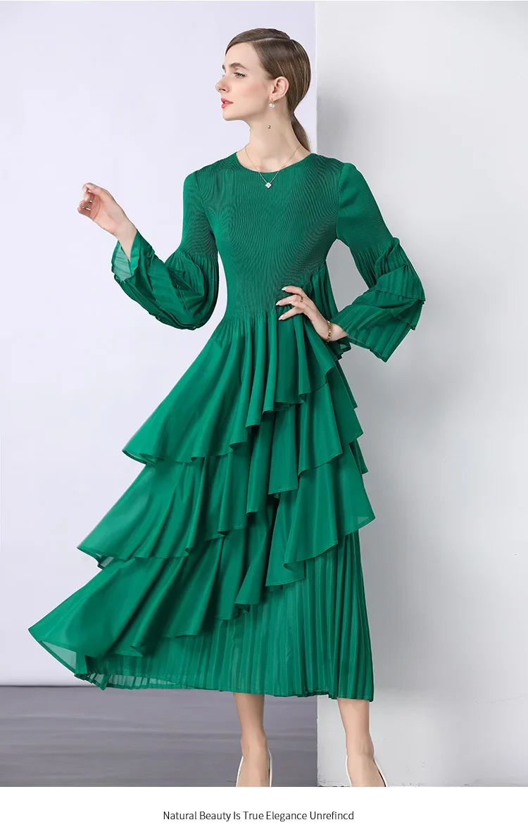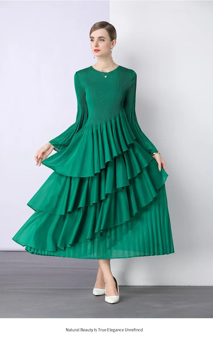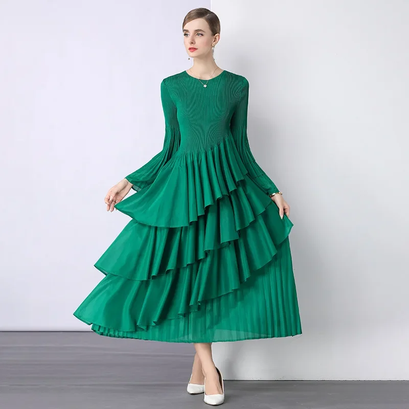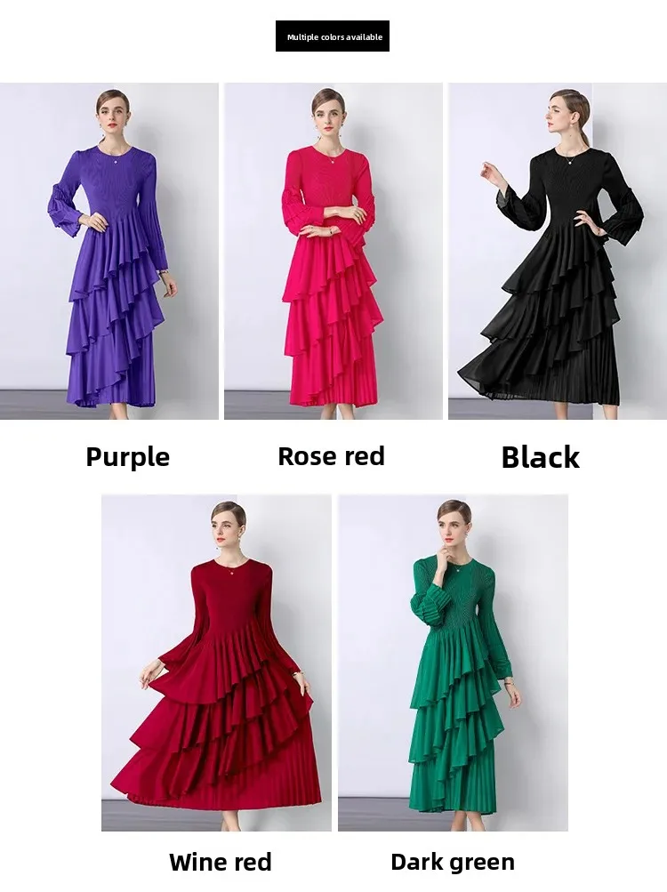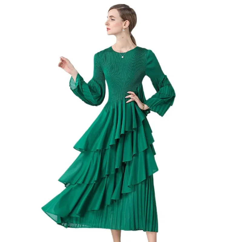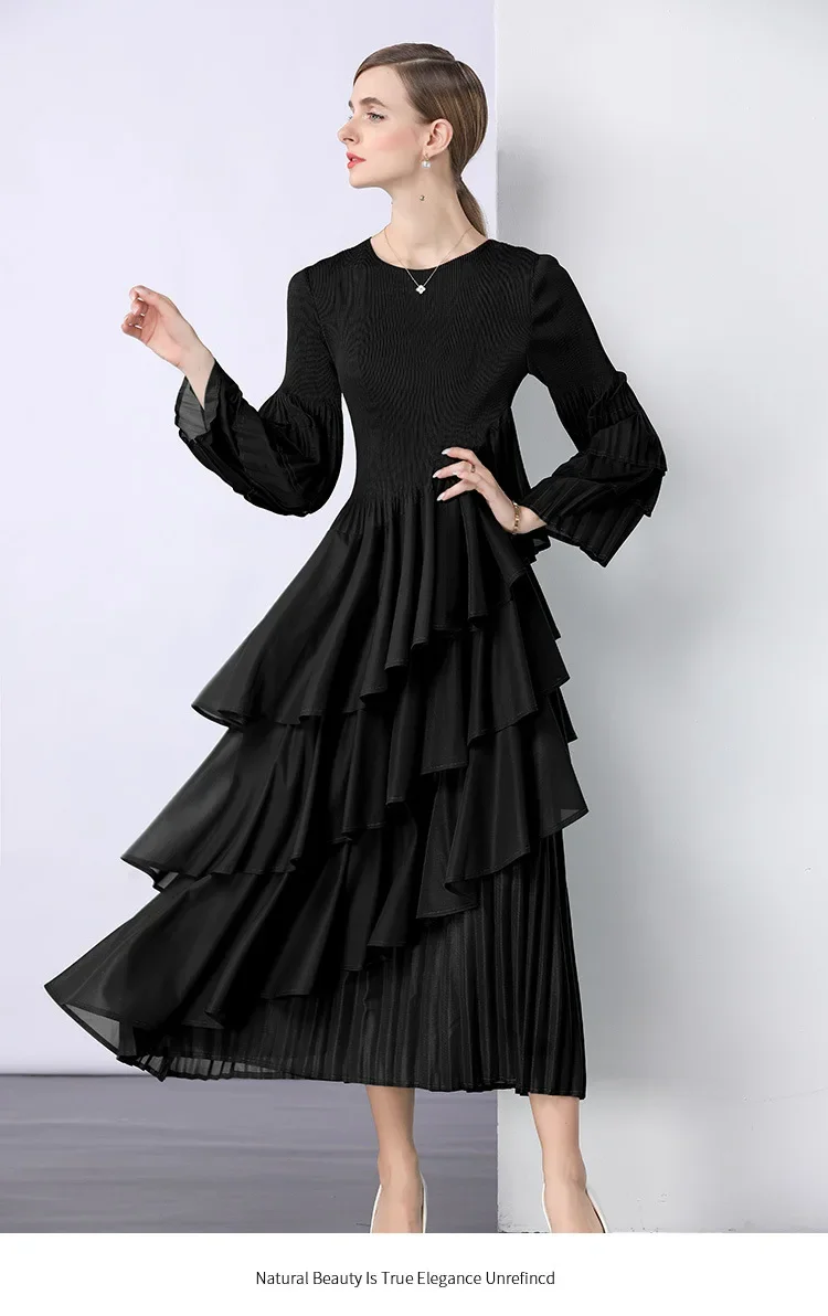 Chiffon Gauze Long Sleeve Empire Waist Dress Draped Skirt Heavy Embellishment Lotus Leaf Edge Light Maturity Style Dress
