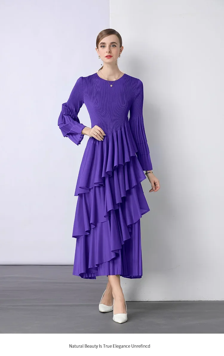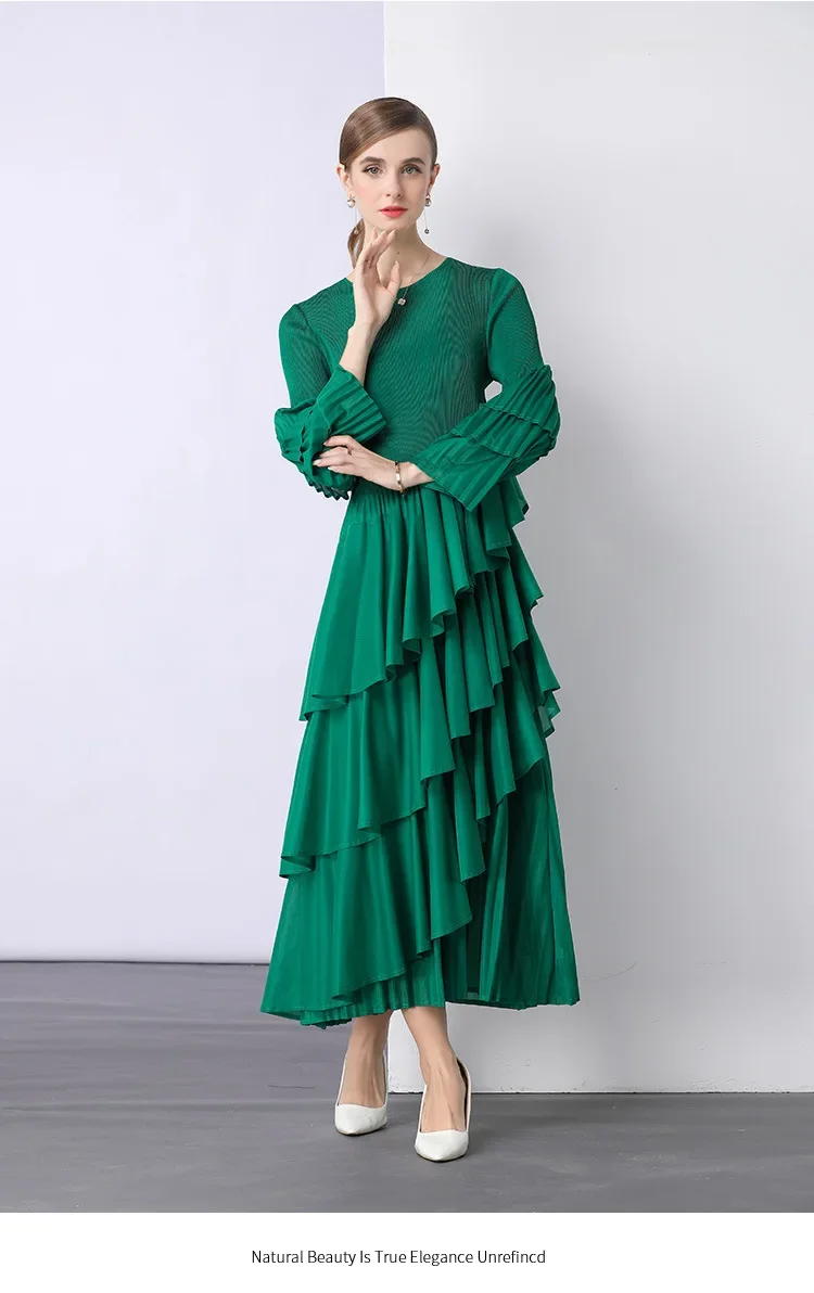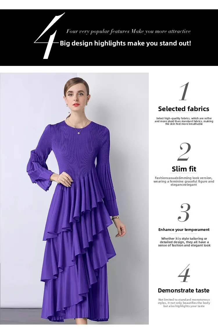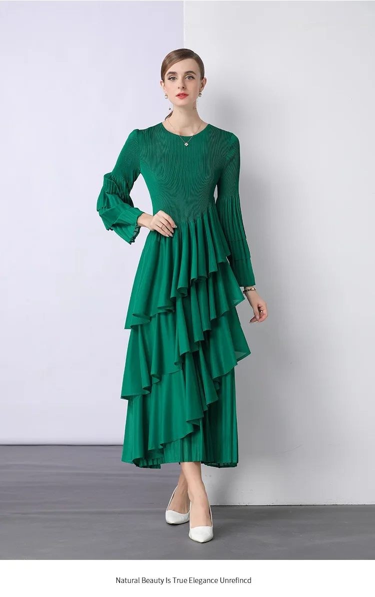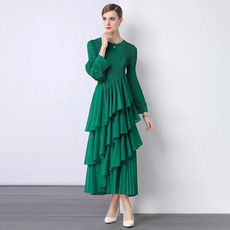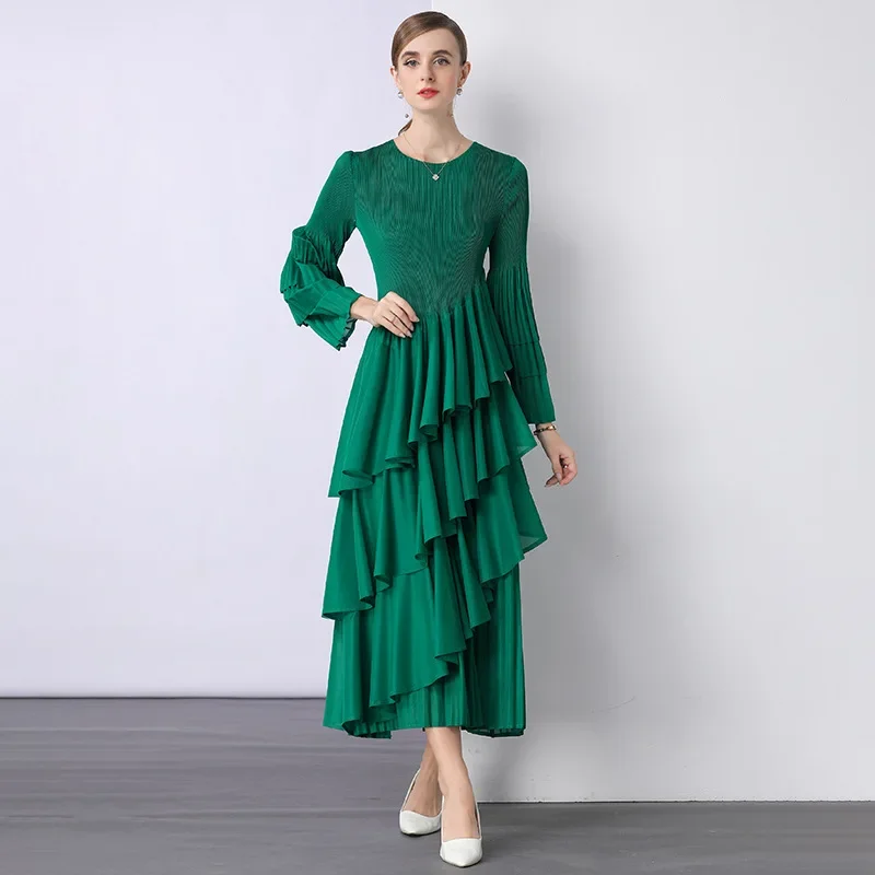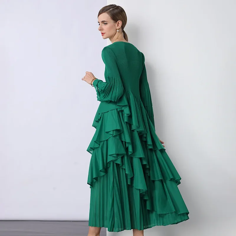 Chiffon Gauze Long Sleeve Empire Waist Dress Draped Skirt Heavy Embellishment Lotus Leaf Edge Light Maturity Style Dress