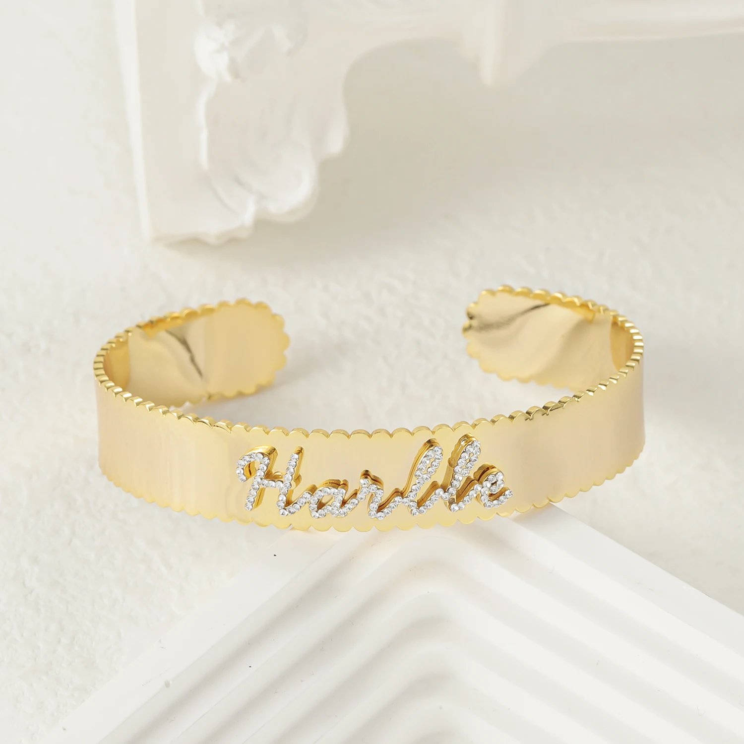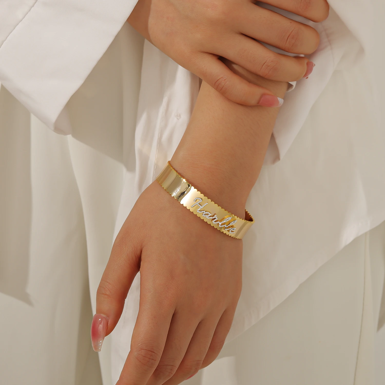 The Personalized Dotted Diamond Name Open Bracelet is a unique and elegant piece of jewelry that blends the beauty of the nameplate with the brilliance of diamonds in a unique and contemporary design. Here is a detailed description of this type of bracelet: